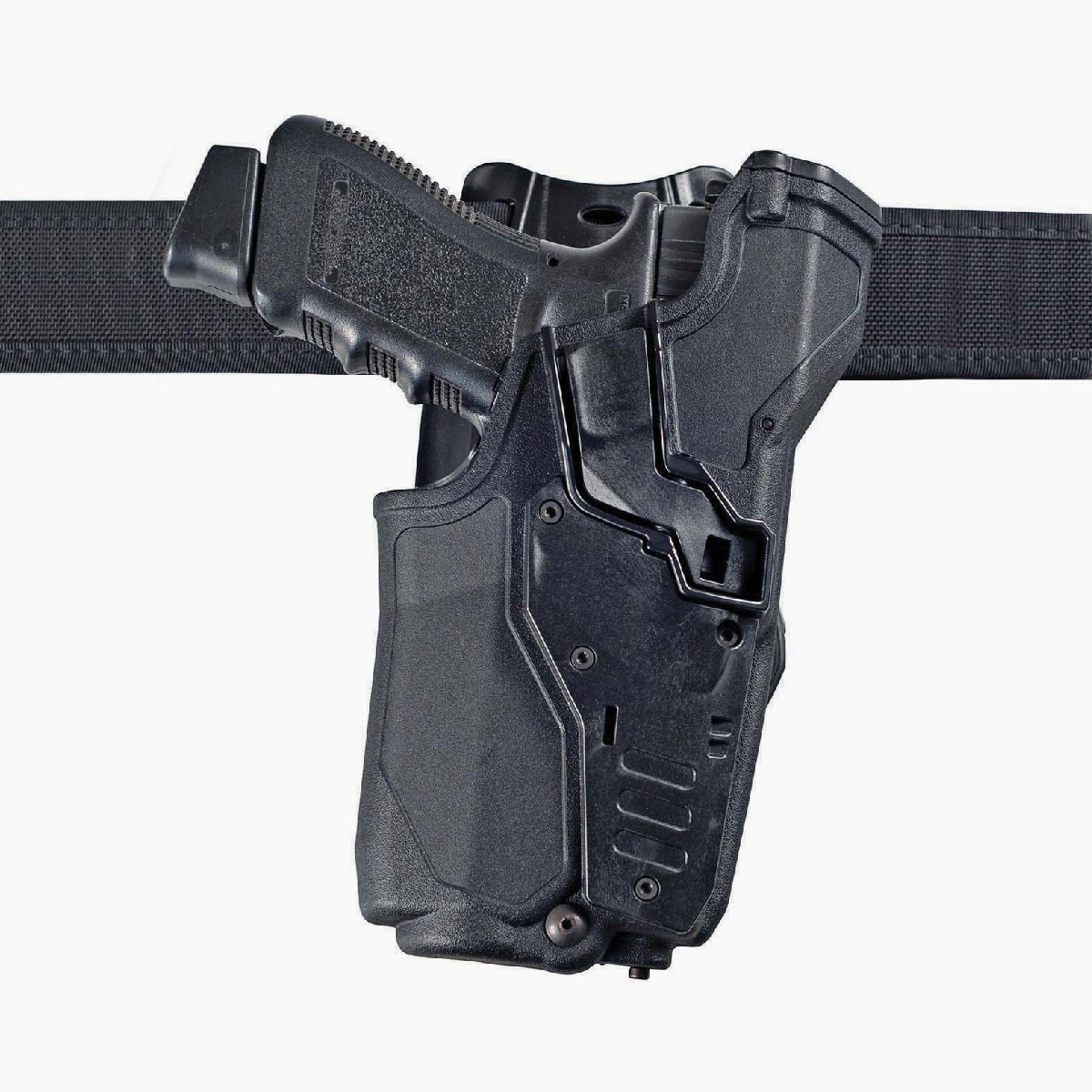 6857 CRAB-PRO is a professional duty holster for both special and routine service. Featuring a design to carry the pistol in standard configuration or with tactical light all in the same holster with no need for manual operation, this new holster has three safety levels and an internal device to hold the pistol horizontally. The first safety level, the innovative L.E.P. Locking on the Ejection Port – is automatically activated with the insertion of the weapon in the holster, thanks to the special internal locking device composed of a self-lubricating polymer lever working on the cartridge ejection port of the pistols slide, thus preventing the drawing of the pistol even when pulled strongly.